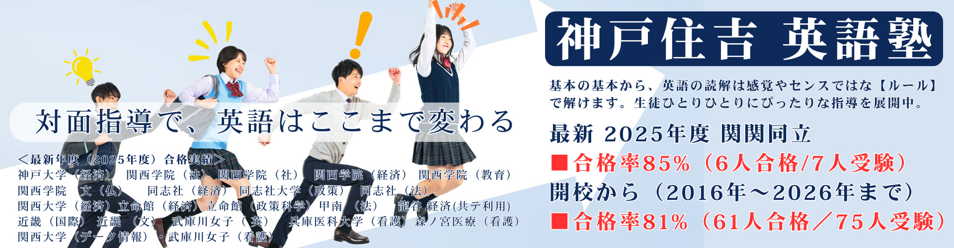 六甲アイランド高校、県立芦屋高校、葺合高校、仁川学院高校、甲南女子高校などの生徒が中心です。英語が得意な生徒だけでなく、苦手な状態から始めて合格する生徒も多いのが特徴です