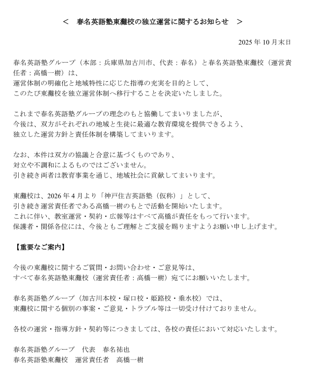 本日、春名英語塾グループと連名で「東灘校の独立運営に関するお知らせ」を発表しました。